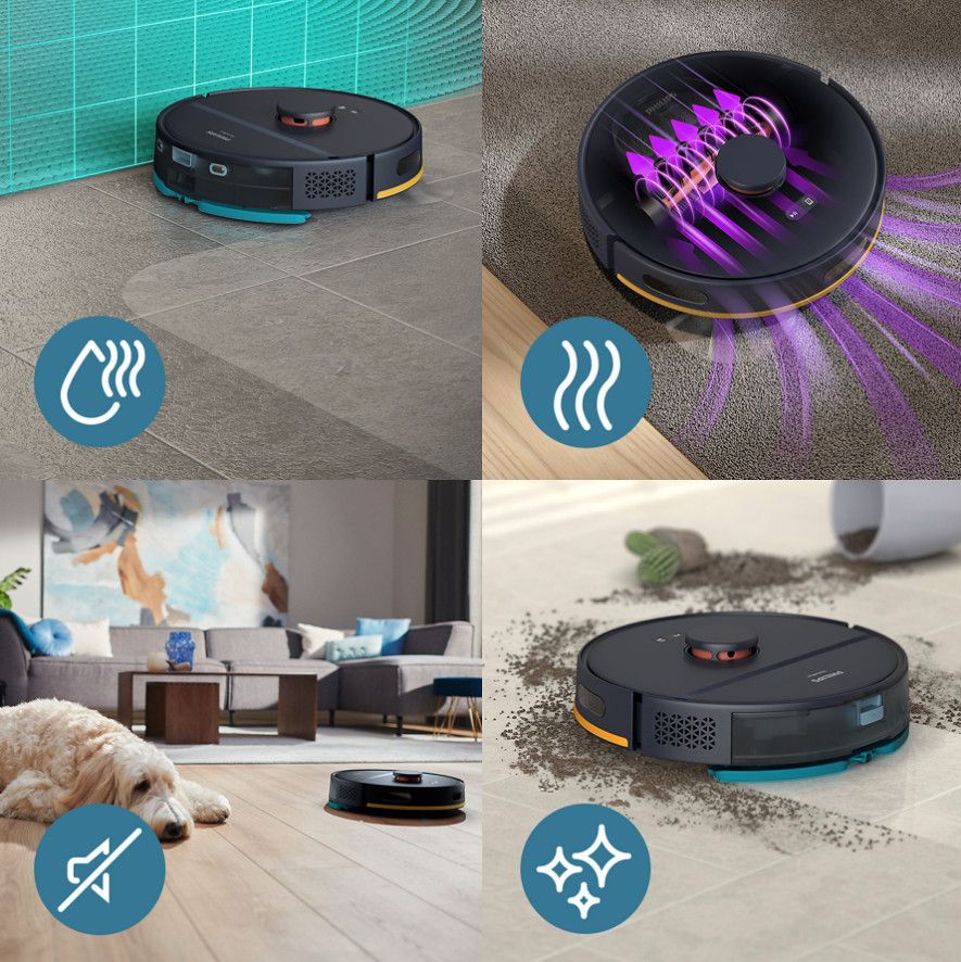 Odkurzaj i mopuj za jednym razem, aby z łatwością usunąć brud, duża siła ssania, która zbiera kurz i brud. Automatycznie zwiększa siłę ssania na dywanach, maksymalny obszar czyszczenia podłogi bez pominiętych miejsc, czyści do 130 minut na jednym ładowaniu.